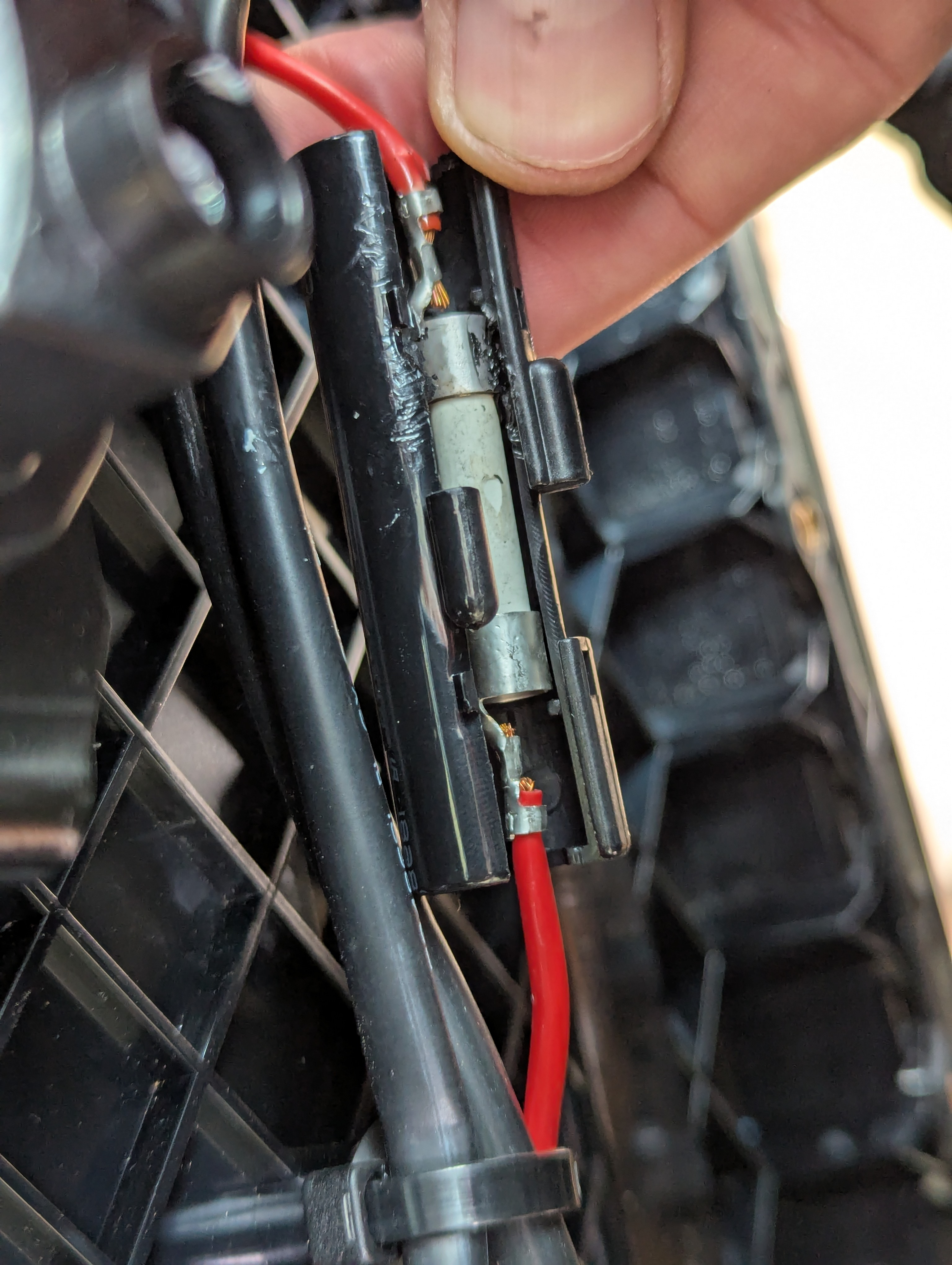 Als ich am Relais die Kabel mir angeschaut habe, ist mir eine schwarze runde Abdeckung am roten Kabel aufgefallen, das leicht angeschmolzen war. Mit etwas Gewalt habe ich die Kappe aufbekommen und die durchgebrannte Sicherung gesehen.