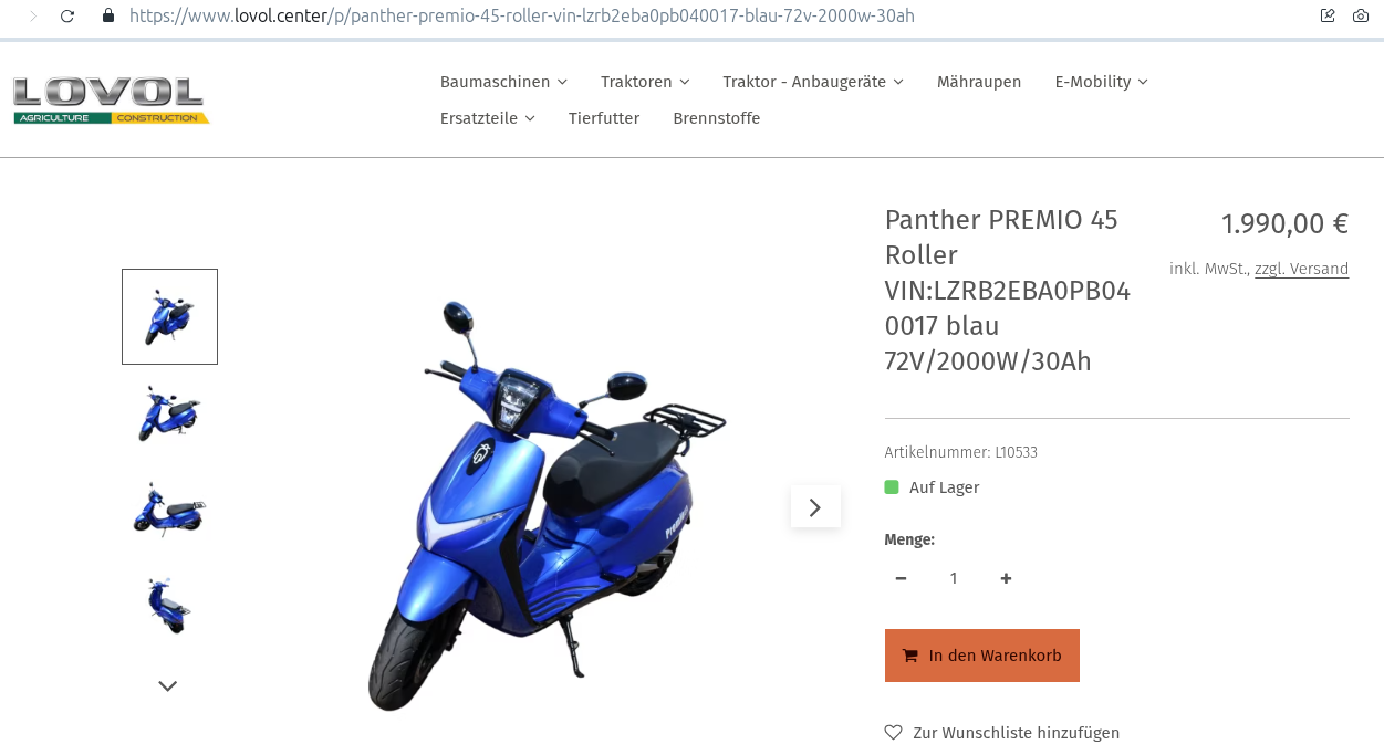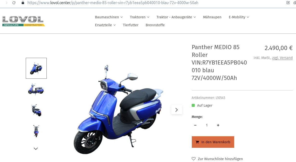 Es wird nach D geliefert. Der 85 km/h-Roller Panther MEDIO 85 würde demnach 2.533 € + Fracht 110 € = insgesamt 2.643 € kosten.