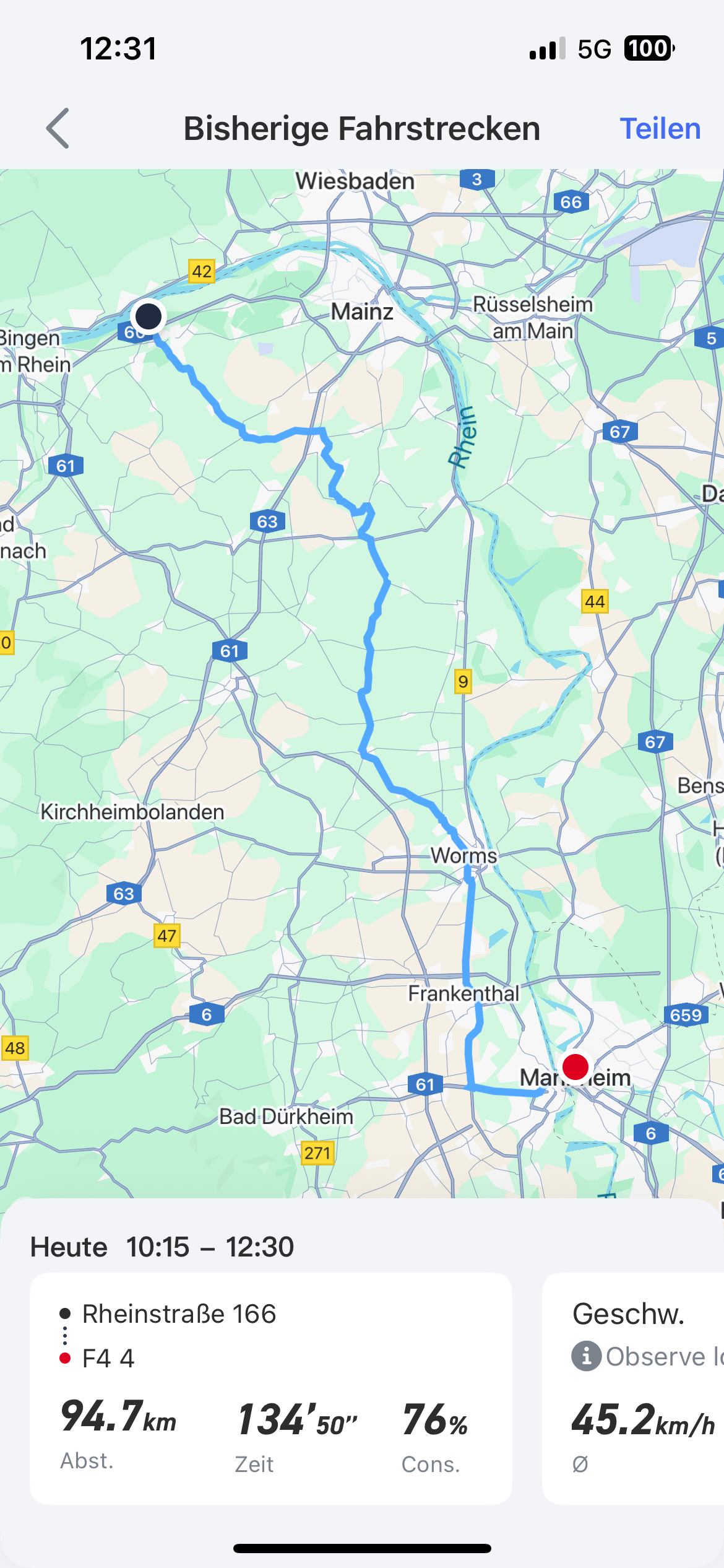 95kg Kerl, Niu mit 51000 km, 95km, 20grad, recht windstill, Fahrt hauptsächlich Überland mit Stufe Dynamic 45 km/h, etwas rauf und runter, nur die letzten 15 km 70km/h. Restkapazität: 24%. Mit Podcast über die Helmkopfhörer, war es nicht mal anstrengend.