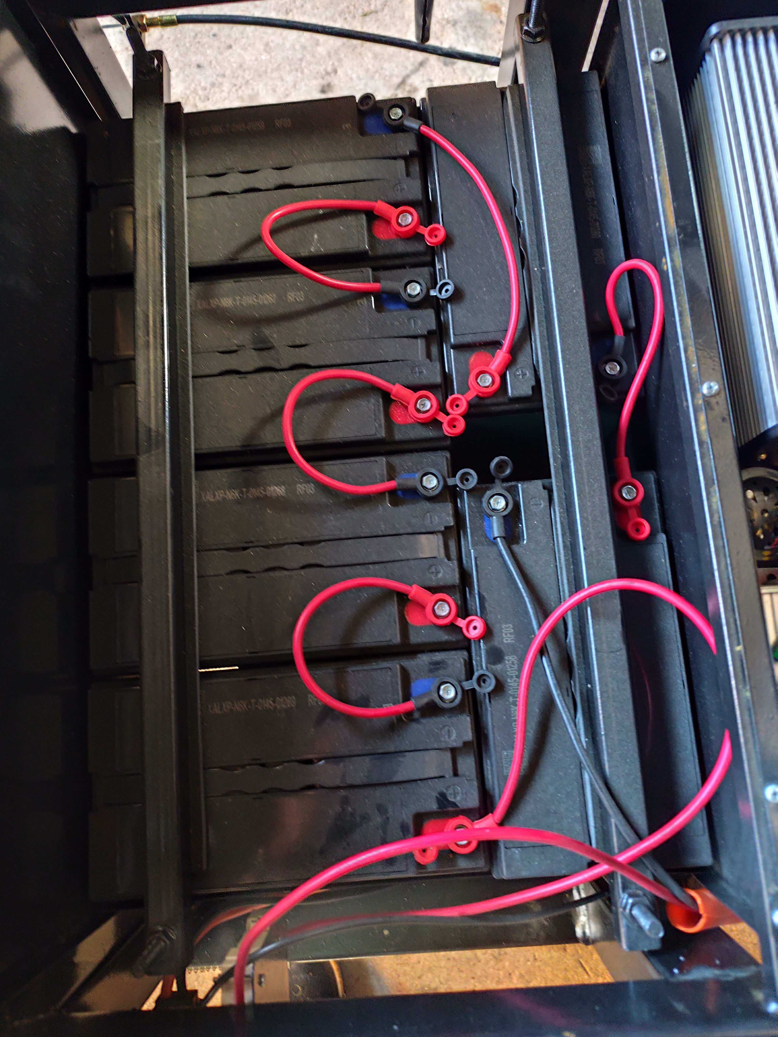 Wenn ein Ladegerät für 12-Volt Auto-Bastterien zur Hand wäre, könnte man die sechs Stück 12-Volt-Blei-Gel-Akkus jeweils einzeln damit Laden, um zu schauen, ob das Ergebnis besser wird. Ansonsten sind die Akkus hin.