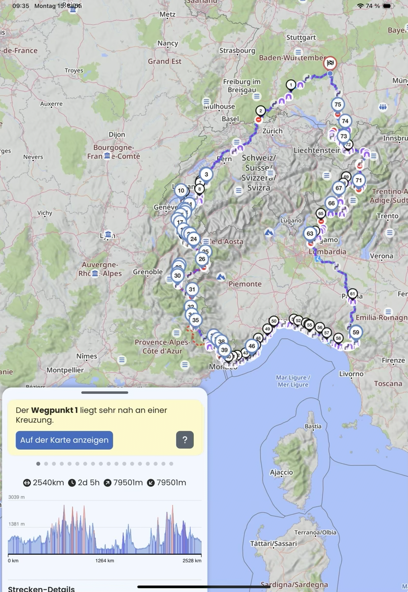 Nachdem wir inzwischen mit der Benzinergruppe Anfang letzten September die Route des Grandes Alpes (https://www.moppedhotel.de/routedesgrandesalpes/) gemacht hatten und dieses Jahr im Juni in der Toskana waren, was lag da näher als beides zu verbinden und das Ganze elektrisch zu fahren. Also von Zuhause an den Genfer See, die RdGA nach Menton, die Via Aurelia entlang der Riviera in die Garfagniana/Toskana und von dort wieder über Südtirol zurück.
