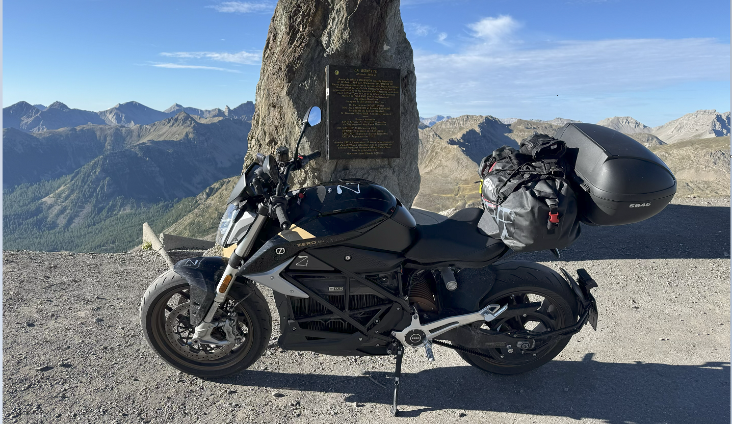 In Jausiers (G) gab es zwar eine Tankstelle, doch der Besitzer ließ mich lieber in seiner Privatgarage laden – wieder mit Trinkgeld belohnt. Am letzten Tag der RdGA habe ich meinen geplanten Mittagstopp gestrichen und erst in Menton (h) am Meer geladen(10kWh) . Nach 198 km hatte ich noch 137 km Restreichweite – ich wäre also sogar ohne Nachladung bis ans Hotel an der Riviera gekommen. Vom höchsten Punkt, der Cime de la Bonette (2.802 m), geht’s eben fast nur bergab – Reichweite deluxe. Mit keinem meiner Benziner habe ich je 330 km am Stück geschafft. Am Cime de la Bonette hatte die Maschine 130Wh/km angezeigt, in Menton dann wieder 52Wh/km.
