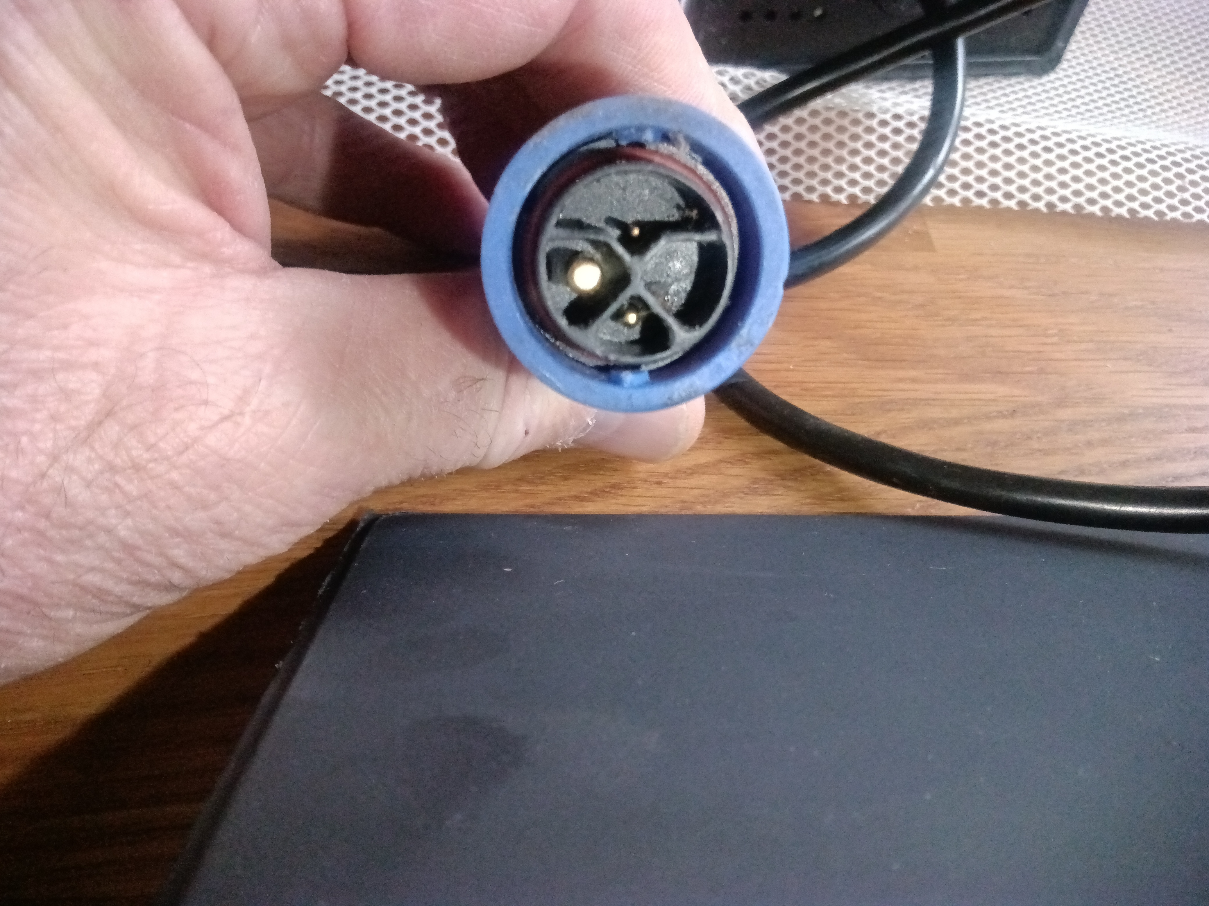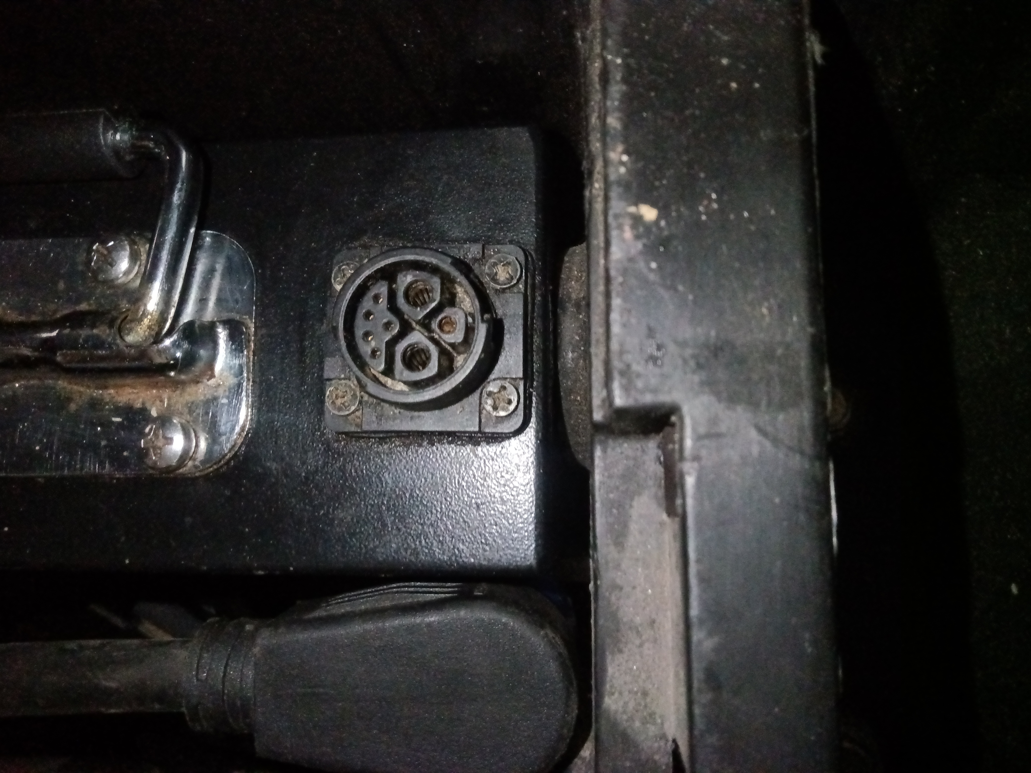Ich versuche mal, die Buchse zu beschreiben: Sie ist rund mit einem Durchmesser von etwa 2cm und hat Steckbuchsen mit drei verschiedenen Größen, zwei dicke (wohl für den Motor-Strom), darunter ein mittelgroßer und darüber fünf dünne.