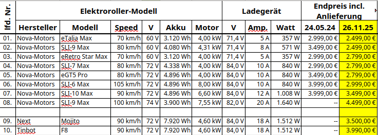 Hier eine kurze Zusammenfassung als Excel-Tabelle für Elektroroller von Nova-Motors (www.nova-motors.de) in der 125er-Klasse: