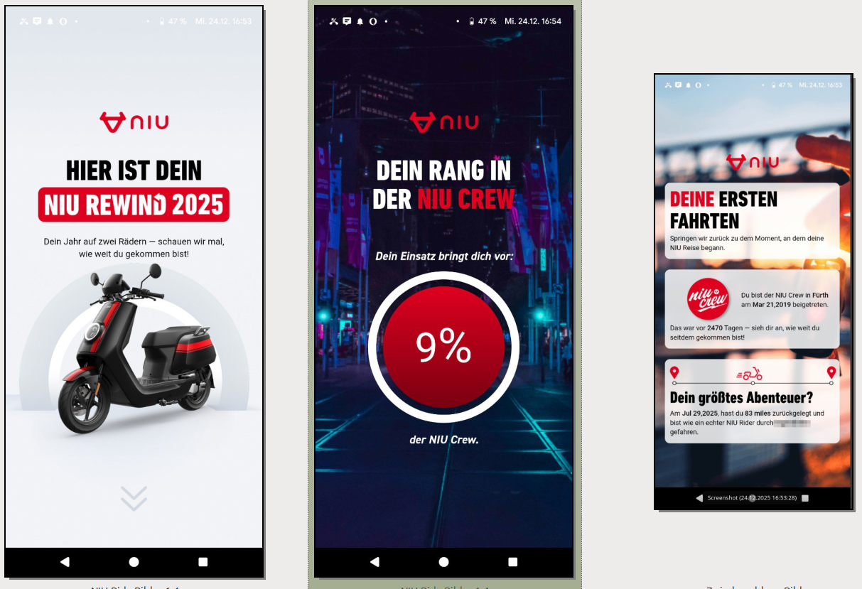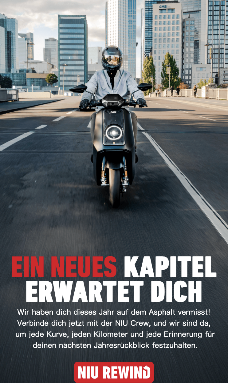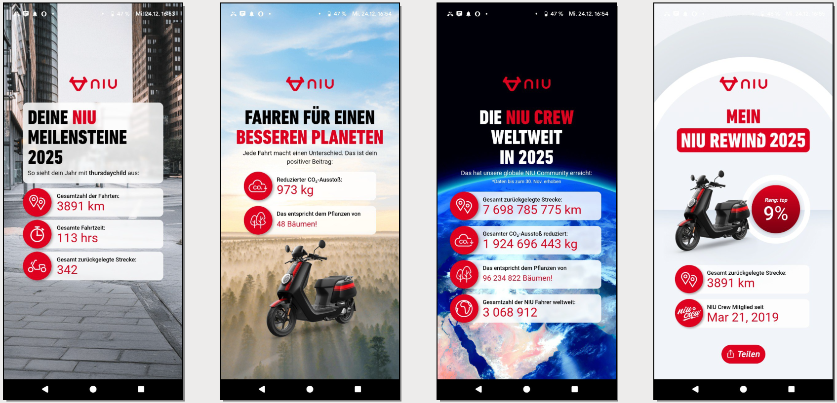 Nichts, weltbewegendes. Wusste man über die App ohnehin schon alles. Einzig die von allen NIU-Fahrern gefahrene Gesamtkilometerleistung ist noch von Interesse.