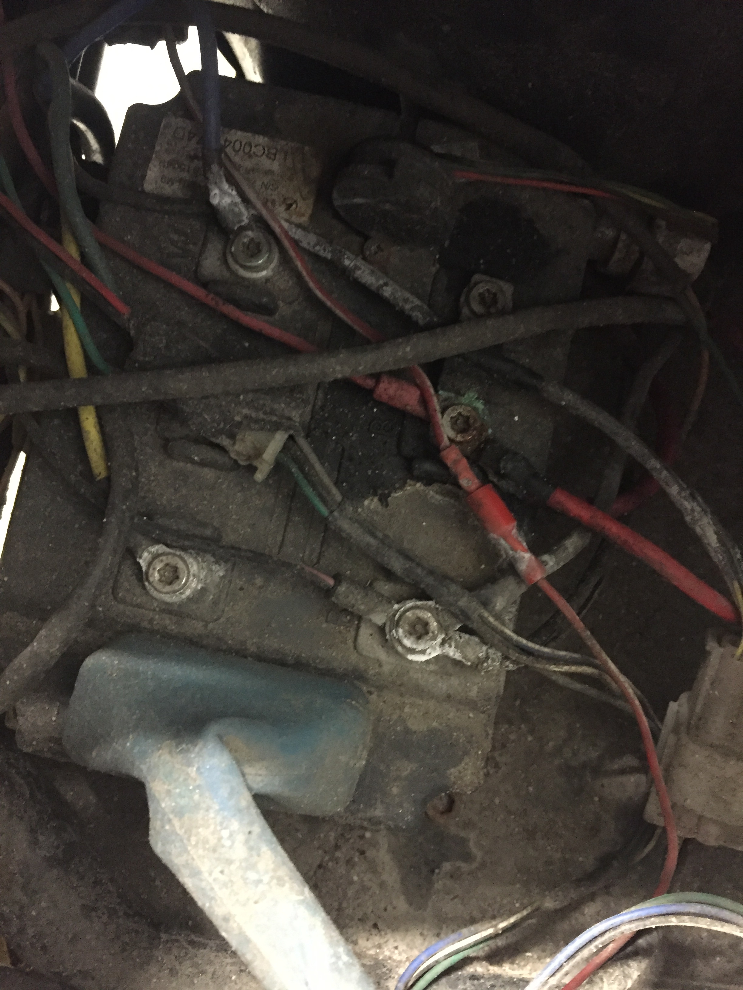 Zustand nach Reinigung der Steckverbindung: Maschine geht an, fährt normal (Probefahrt also machbar), geht aber nicht wieder auszuschalten. Vermutlich diesmal ein Kurzschluss von 12V auf das Kabel vom Ein-/Ausschalttaster, oder es ist noch leitende Suppe im Multistecker.