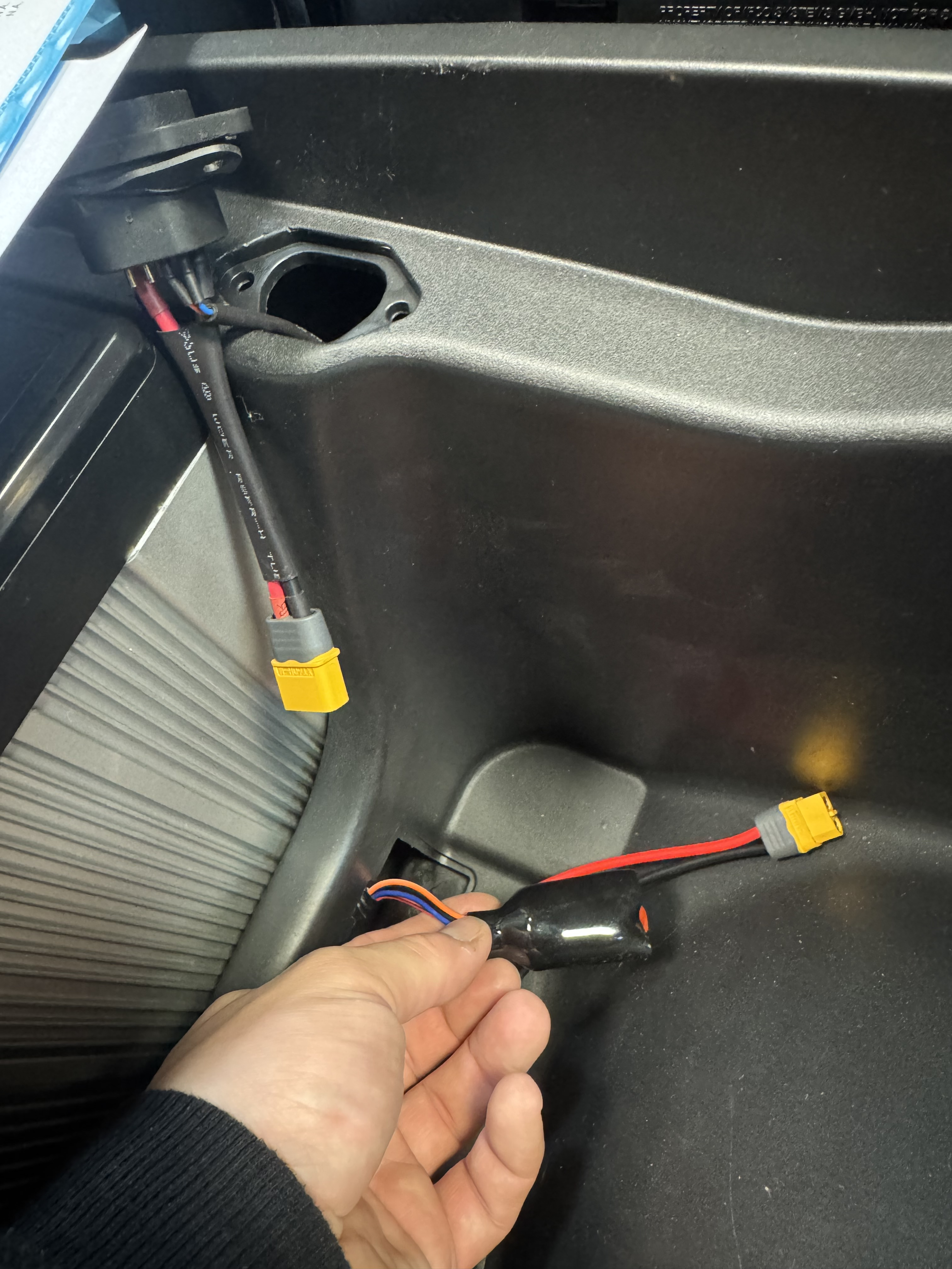 Ich habe die Ladebuchse aufgeschraubt: Intern mündet die Buchse in einem XT60- oder XT90-Stecker. Da ich bereits eine M25 2+1+4 Buchse sowie ein passendes Ladegerät mit M25-Stecker bestellt habe, plane ich nun, die M25-Buchse mit einem passenden XT-Gegenstück zu versehen und so anzuschließen.