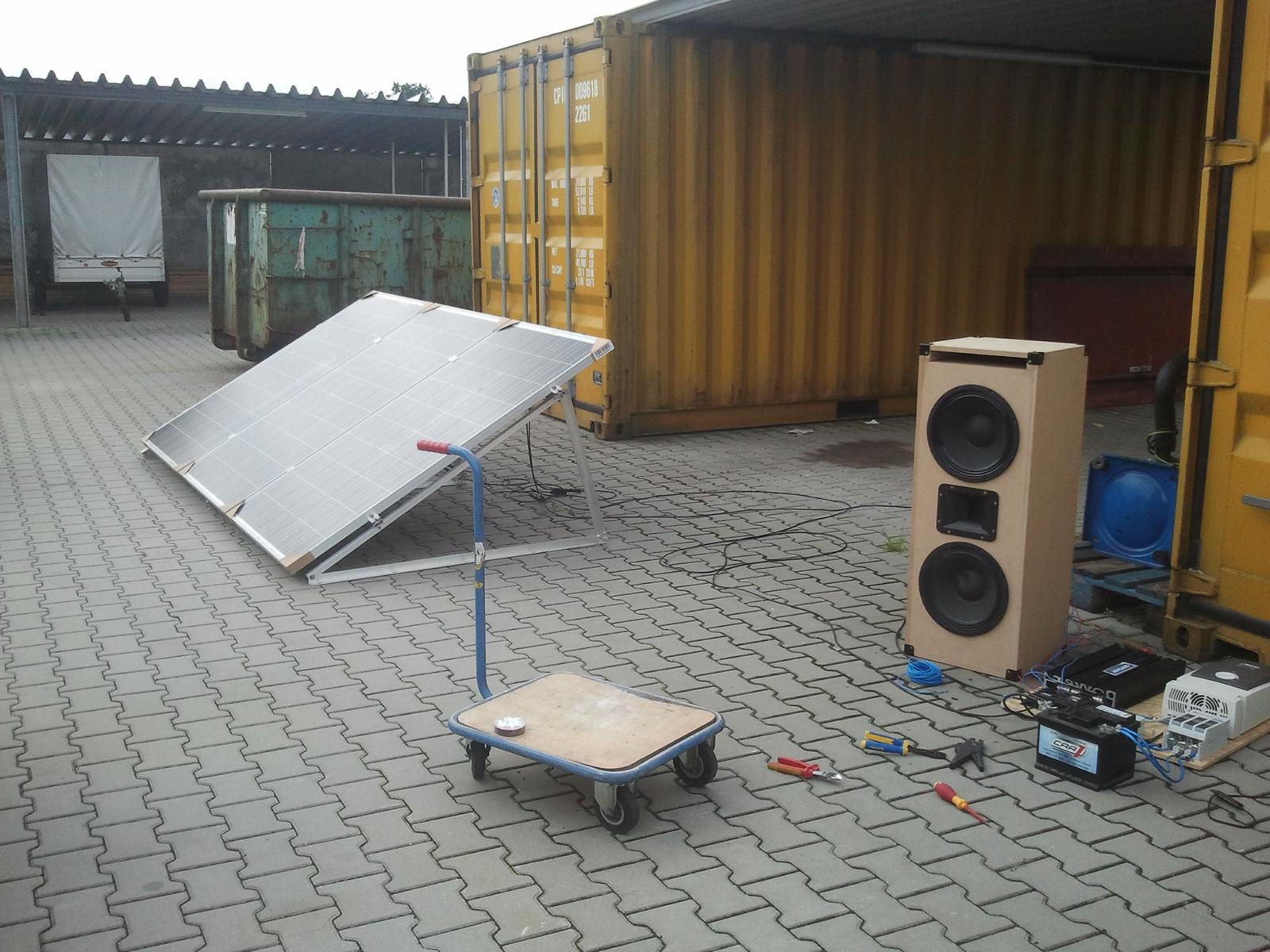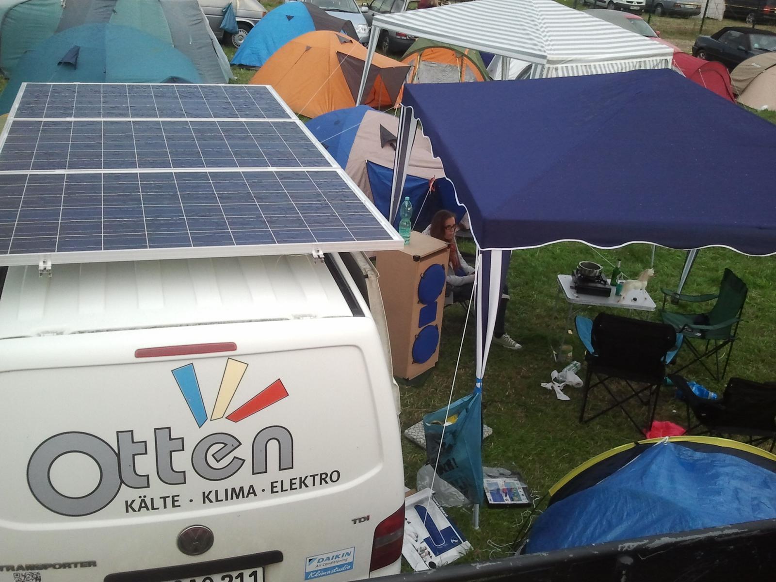 Drei Module die mal bei Projekten übrig geblieben sind, ein Shunt-Regler, ein Wechselrichter und ein paar alte Autobatterien vom Schrotti und welche die so rumstanden. Hat auf dem Festival für Musik, Kühlschrank und Handys aus der gesamten Umgebung laden wunderbar gereicht. Ein Jahr später habe ich dann auf fünf Module, zwei Shunt-Regler und zusätzliche Batterien aufgestockt, weil noch ein zweiter Kühlschrank dazu kam. Mit dreien auf dem Dach gefahren (die Module sind ja schließlich für Orkan ausgelegt, dann müssen sie auch 130km/h auf der Autobahn aushalten), vor Ort dann noch die zusätzlichen Aluschienen und Module montiert.