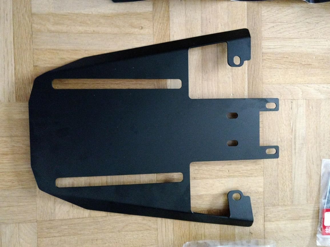 Gepäckträger aus schwarz lackiertem Stahl, dieser macht einen erstaunlich stabilen Eindruck, ob ich Ihn verwenden werde weiss ich noch nicht, da ich mir in der zwischenzeit den Originalen besorgt habe. (Ansonsten Ebay)
