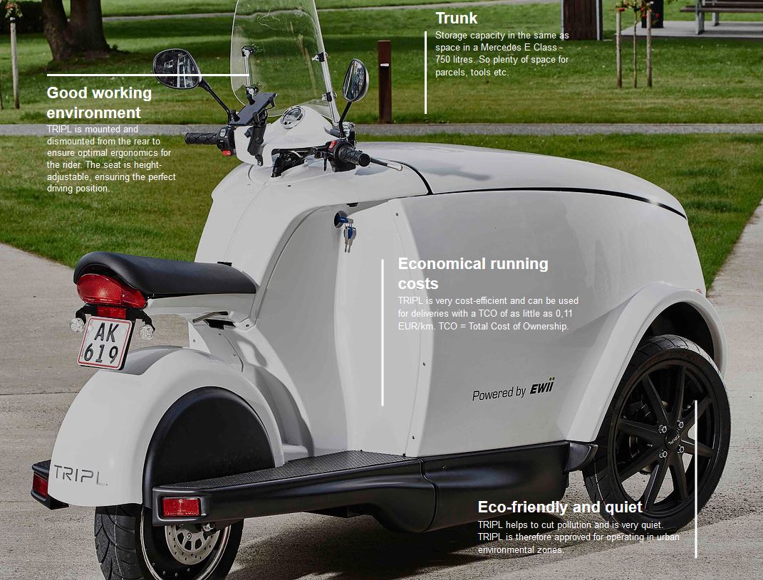 Nicht ganz billig, dafür aber eine interessante Alternative zu bestehenden (Auslieferungs-)Fahrzeugen im urbanen Raum ist der Tripl, der demnächst von GLS in Dortmund getestet wird.