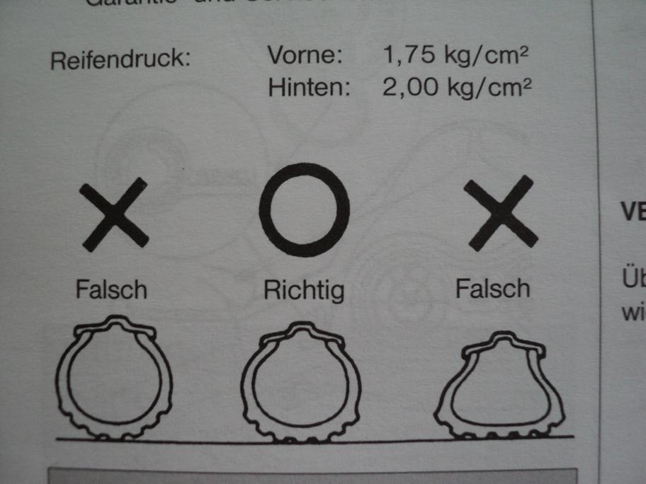 Dem von mir sehr geschätzten STW muß ich ausnahmsweise widersprechen. 2,3 bar sind zu wenig? Die Hersteller von genauso schweren Benzinrollern empfehlen so um die 2 bar. Hier ein Auszug aus der Bedienungsanleitung meines Daelim Otello BJ 2001, Reifen 130/60-13, Gewicht vollgetankt 124 Kg: Vorne 1,75 bar, hinten 2,0.