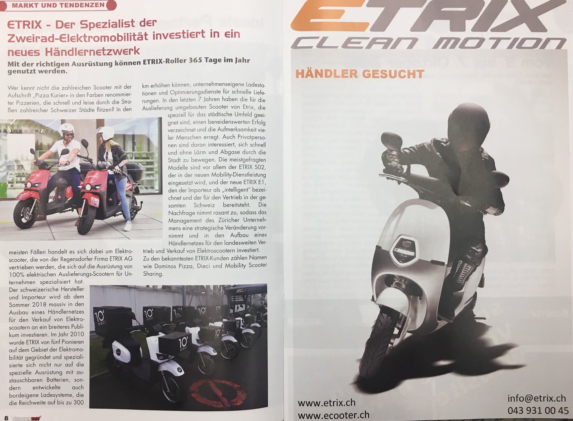 Bereits länger auf dem Markt ist die Firma ETRIX in der Schweiz. Mit zeitgemässen und leistungsstarken E-Scootern bietet ETRIX ein innovatives, nachhaltiges und zugleich erschwingliches Produkt an. Elektroroller sind zukunftsweisende Fahrzeuge mit Vorteilen besonders im urbanen Raum und auf kurzen oder mittleren Strecken.
