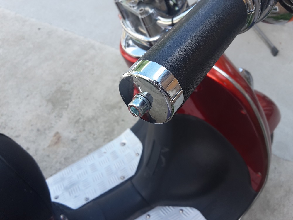 Der Vorbesitzer hatte das schon mal repariert. Er hat ein Stück Holz in den Lenker gesteckt, ein Loch in die Griffkappe gebohrt und diese dann mit einer Schraube gesichert. Bei der Probefahrt hat sich das allerdings gelöst, weshalb ich den Roller schließlich für 250 € bekommen habe.