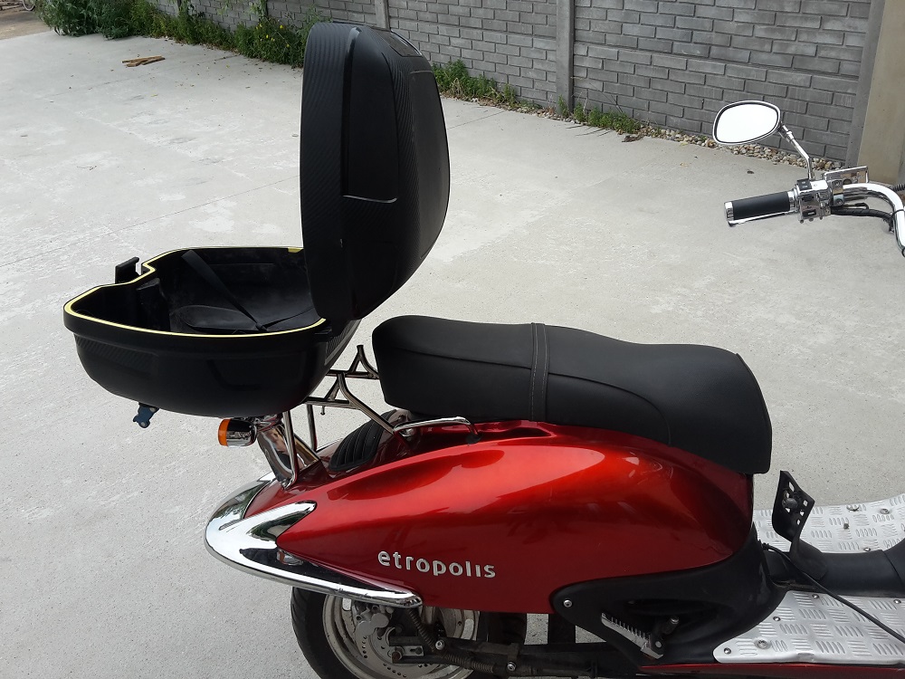 Mein Roller hat so eine Rückenlehne für den Beifahrer. Die sieht ein bisschen behindert aus. Sie stört den Beifahrer auch beim Aufsteigen. Ob man die braucht, damit der Beifahrer nicht hinten runter fällt, bezweifle ich. Und vor allem kann ich mein Topcase so nicht ordentlich montieren. Entweder muss ich es furchtbar weit hinten oder oben anbauen, oder ich bekomme den Deckel nicht richtig auf. Also Flex raus und weg mit dem Ding. Hier das Ergebnis: