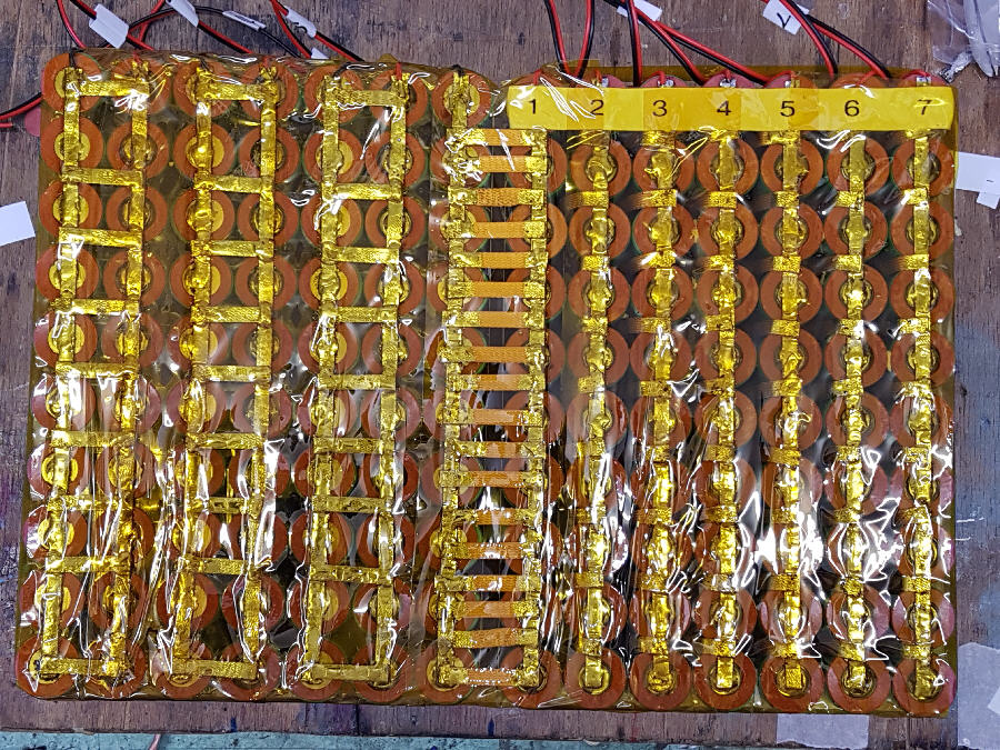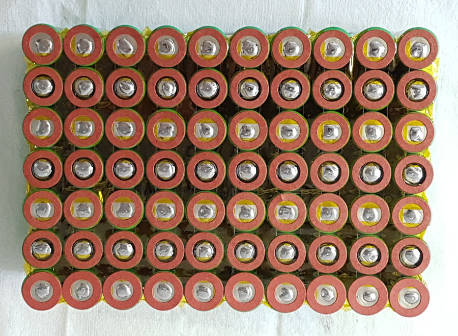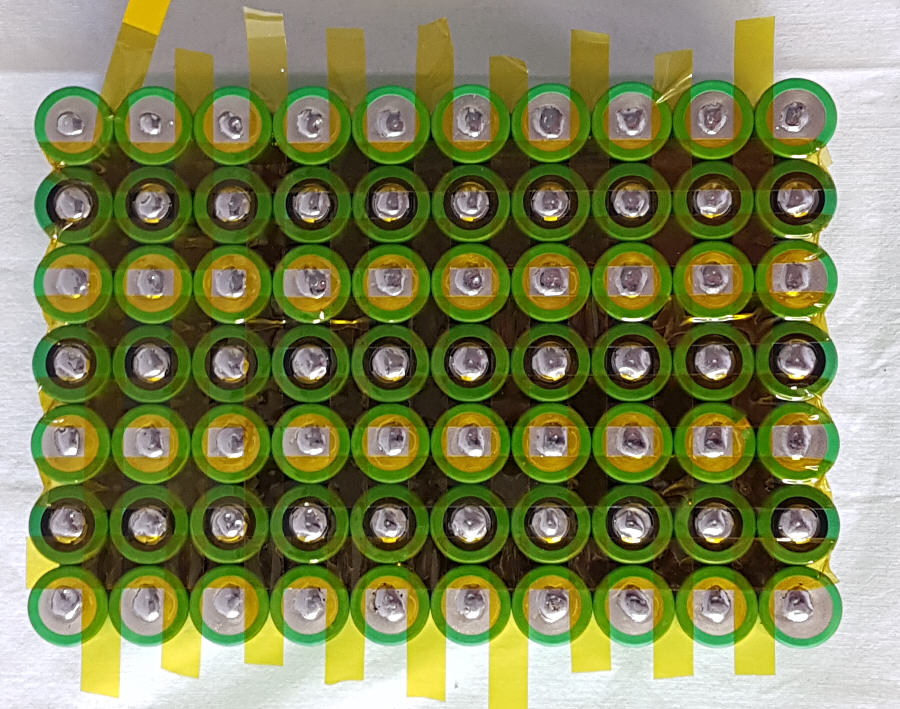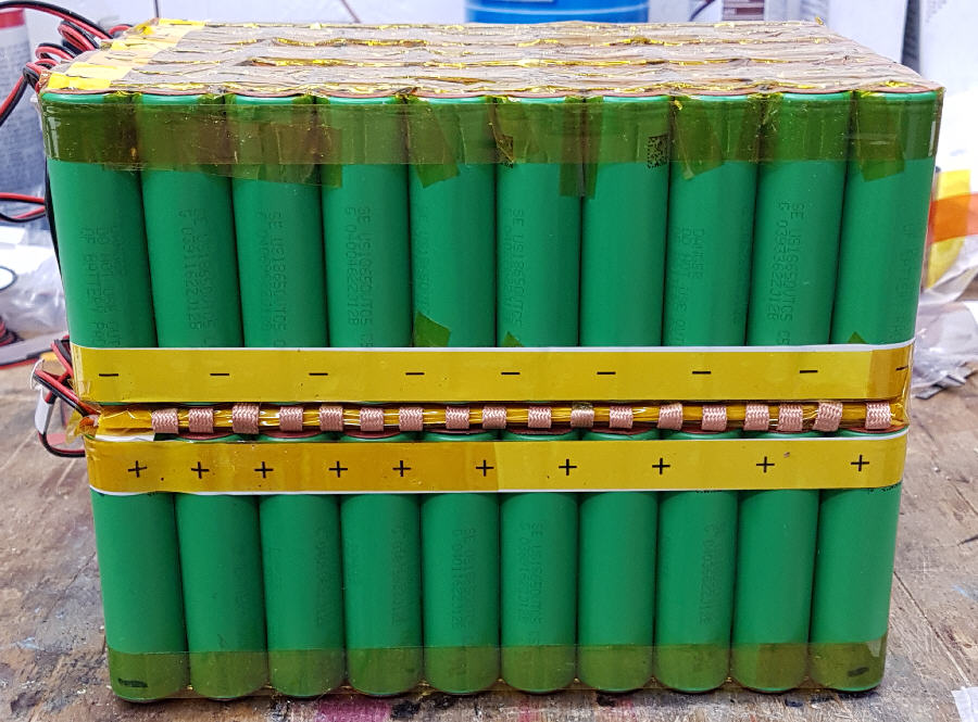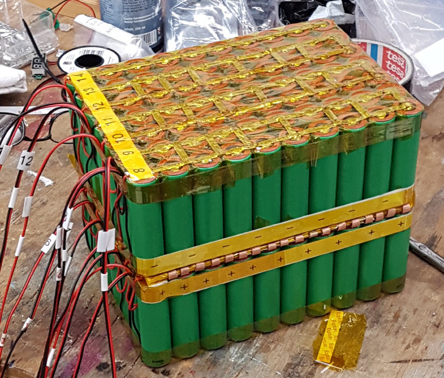 Der Raum zwischen den Zellen wurde mit Kaptonband für zusätzliche Isolierung abgeklebt. Zusätzlich wurden noch Kartonscheiben aufgeklebt. Gibt es alles für kleines Geld bei Amazon. Bei der Frage nach den elektrischen Verbindern fiel die Wahl auf 5mm breite Entlötlitze. Sie hat einen wesentlich geringeren Widerstand als die Nickelbänder und die Verlötung lässt sich durch das Geflecht besser beurteilen als das bei einer geschlossenen Metallfläche der Fall wäre.