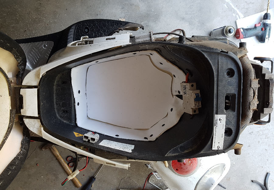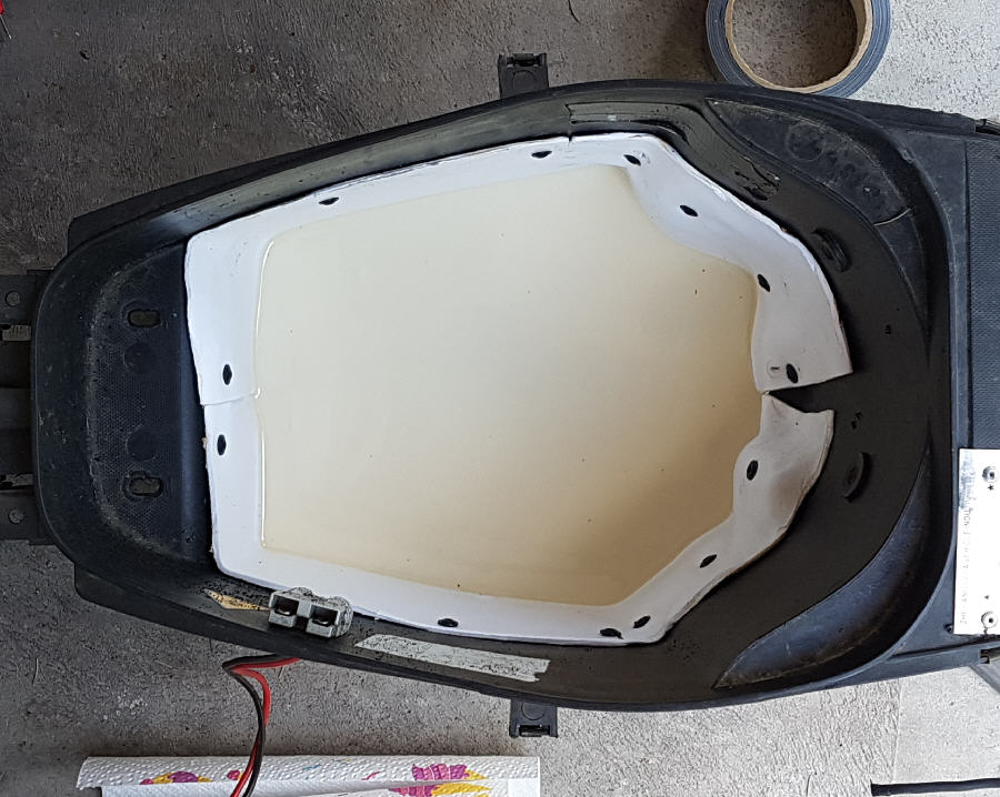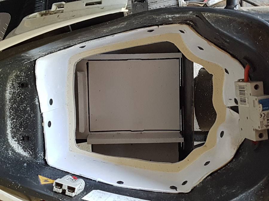 Vom Helmfach wurde der Boden abgeflext, die Seitenwände mit PVC Platten ergänzt, der neue Boden angeklebt und mit einer 5mm dicken PU Harz Schicht ausgegossen. Die PVC Platten lassen sich mit einem Heißluftgebläse sehr gut adaptieren. Aus Kömazellplatten wurde eine neue Halterung für den Akku in das alte Akkufach eingepasst und dann der Boden des Helmfachs mit der Stichsäge so ausgesägt dass ein etwa 1cm breiter Rand verblieb. Durch diese Öffnung lässt sich der Akku nun problemlos herausnehmen. Der Einlegeboden wurde aus einer PVC Platte ausgesägt und verschließt die Öffnung. Natürlich lässt sich das alles handwerklich sauberer ausführen als ich das hier getan habe, aber ich wollte an einem Samstag fertig werden. Die Übergänge am Helmfach kann man noch verspachteln und lackieren oder mit Panzertape abkleben.