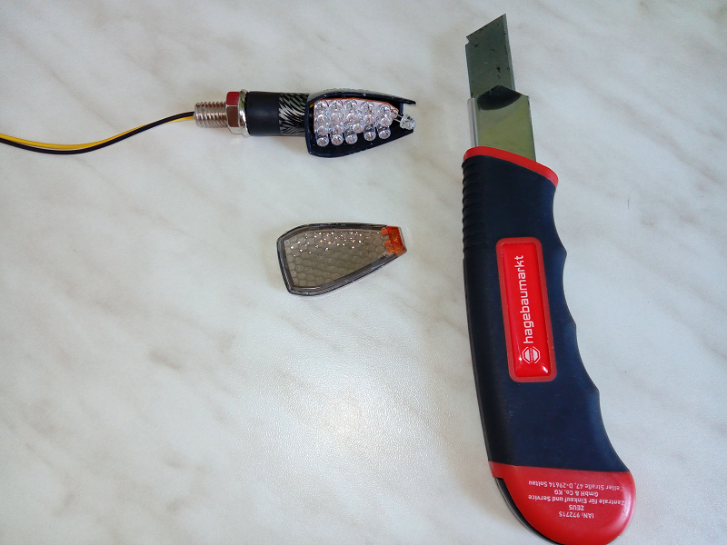 Das öffnen gestaltet sich von Blinkerart und typ immer ein wenig knifflig. Vorsichtiges öffnen geht aber mit einem guten Cuttermesser.