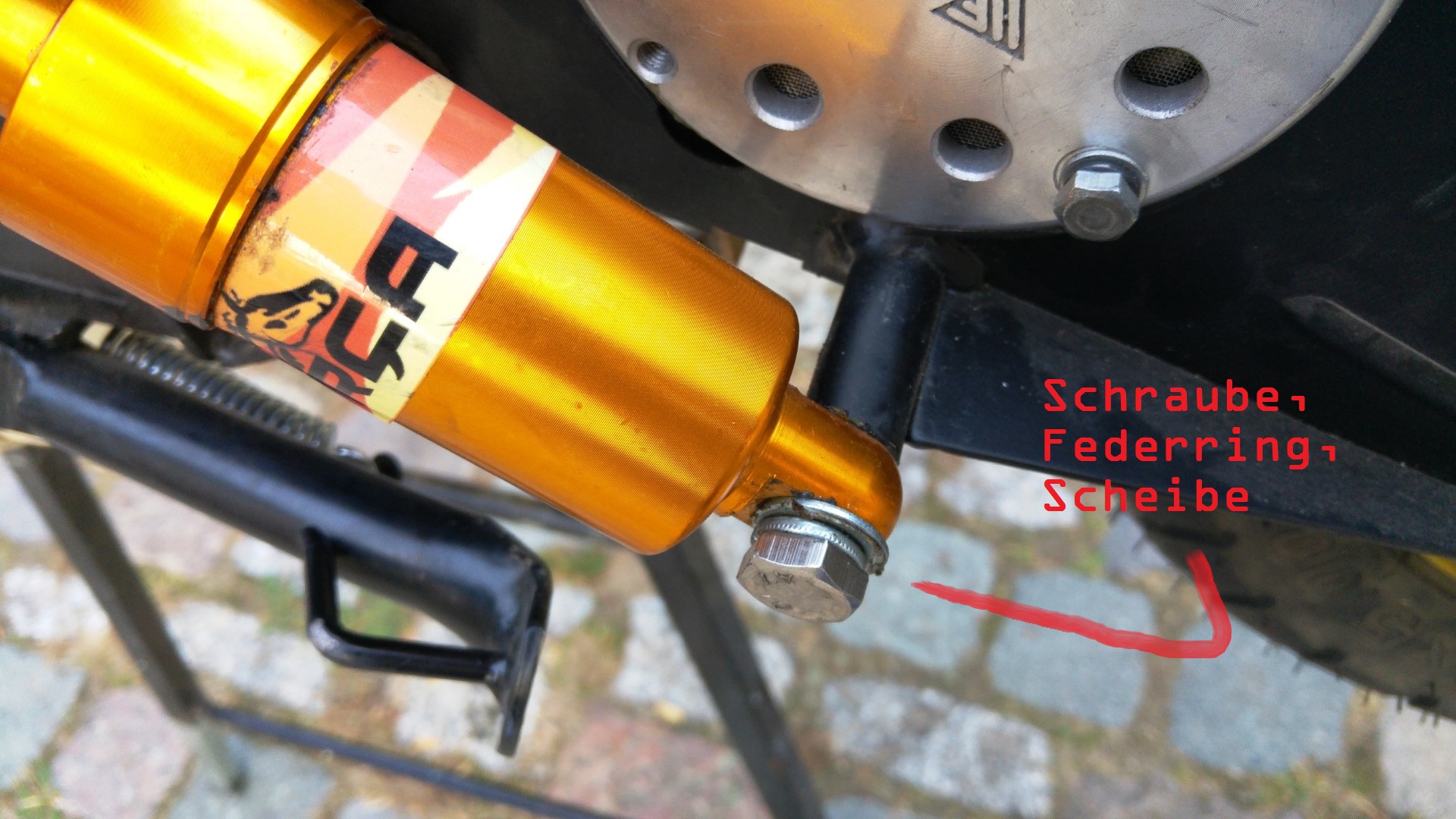 Bei doppelten Federbeinen dementsprechend beide Federn gleichmäßig mit einem passenden Schraubenschlüssel verstellen.