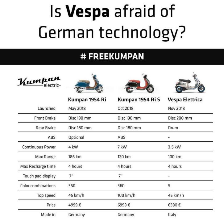 Als Reaktion der miesen Aktion von Piaggio hat Kumpan eine Vergleichstabelle erstellt, leider eine falsche: