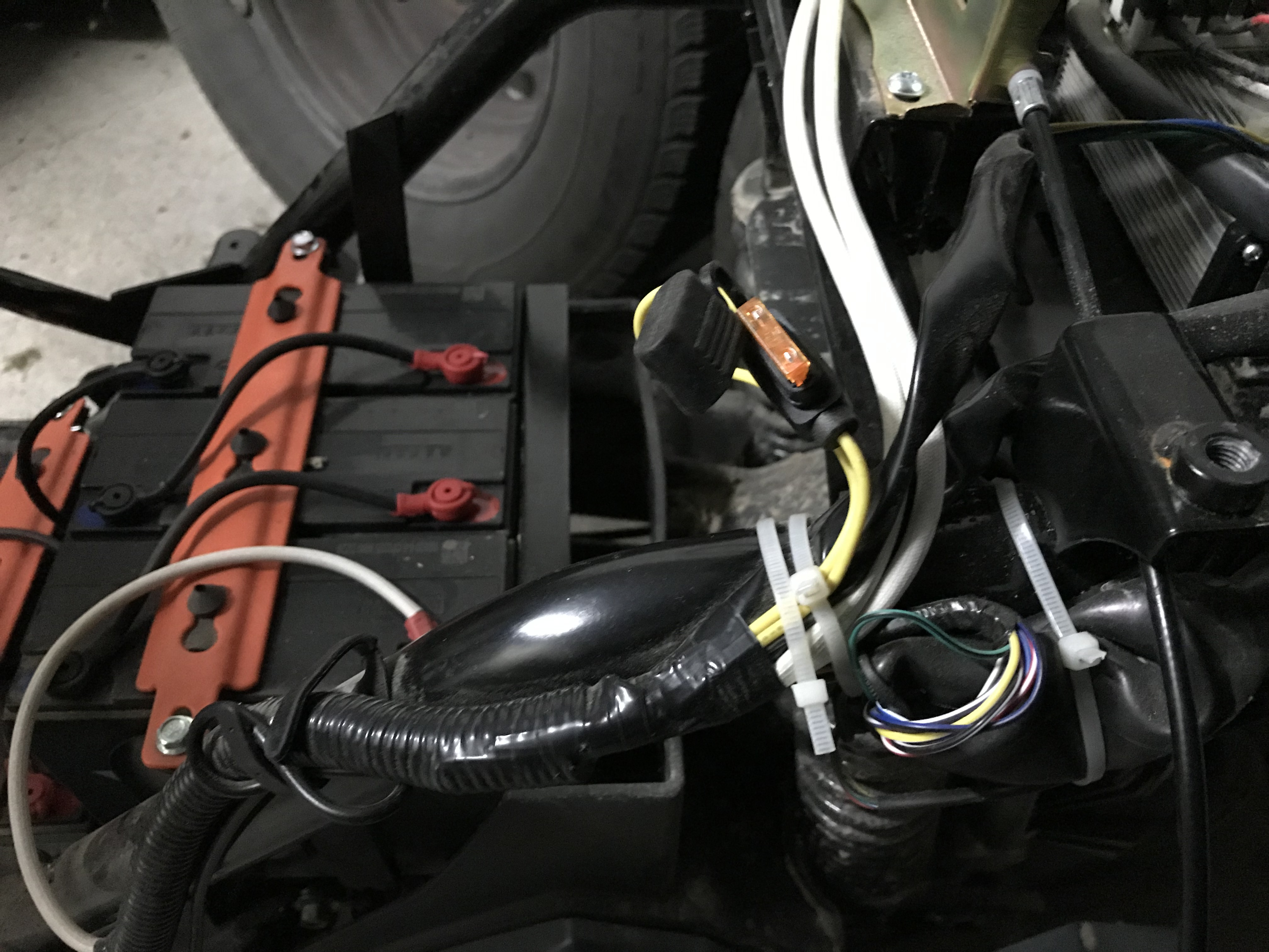Ich habe eine 5A Sicherung Hinten Links. So wie ich das sehe geht die Leitung vor zum Zündschloss und dann geht es weiter in den DC-DC Wandler, der macht dir die 12v für Beleuchtung und hupe und so weiter.