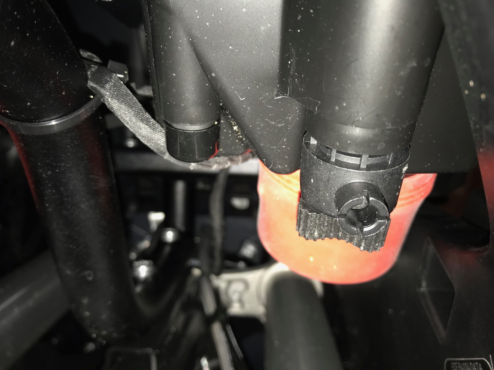 Die LED-Lampen sind leider durch den Kühlkörper nebst aktivem Ventilator natürlich deutlich länger als die originalen Halogenstifte, so das die Staubkappe nicht mehr draufpasste. Da ich keine Lust hatte die originalen Kappen zu zerschneiden, bin ich in der Bucht fündig geworden, und habe der BMW 2 Gummi-Mostkappen in 65mm Durchmesser verpasst, diese passen auch absolut perfekt auf die Lampe.