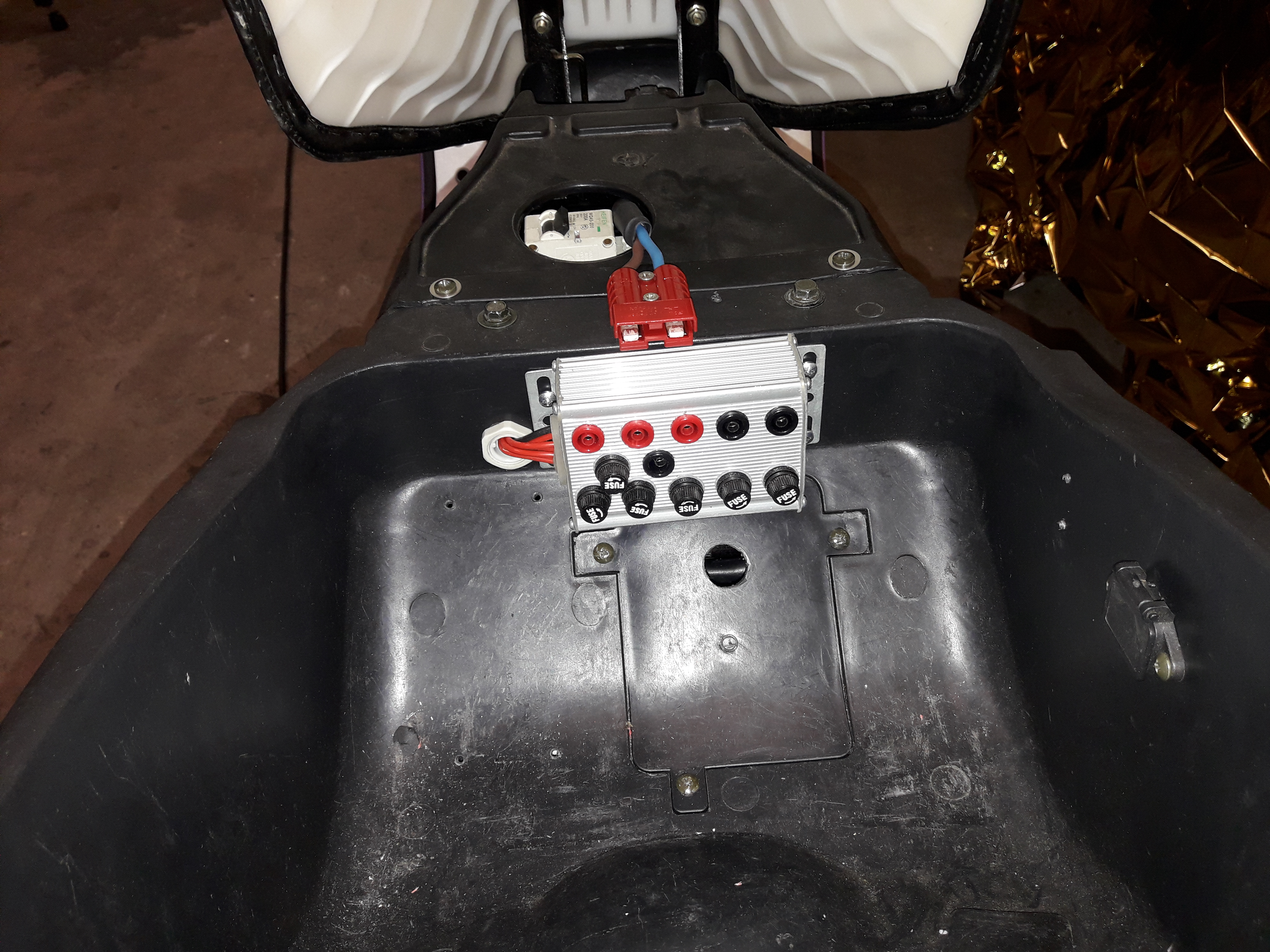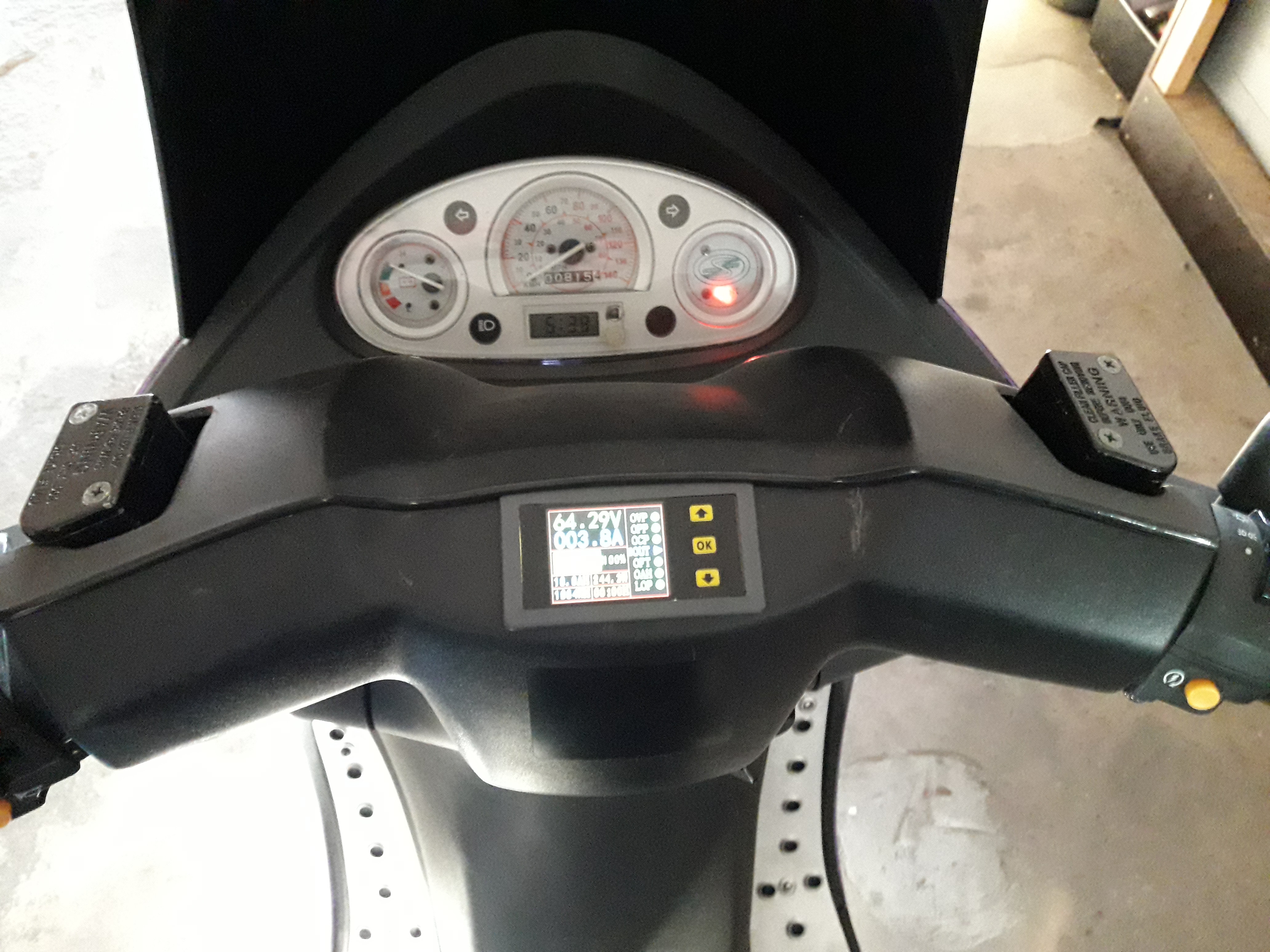dann eine verbrauchsanzeige mit strommessung in die lenkerverkleidung installiert dann einzelzellenabgriff zum batterie pflegen.habe ich aus dem alten 12v konverter gebastelt.alle zuleitungen einzeln abgesichert.