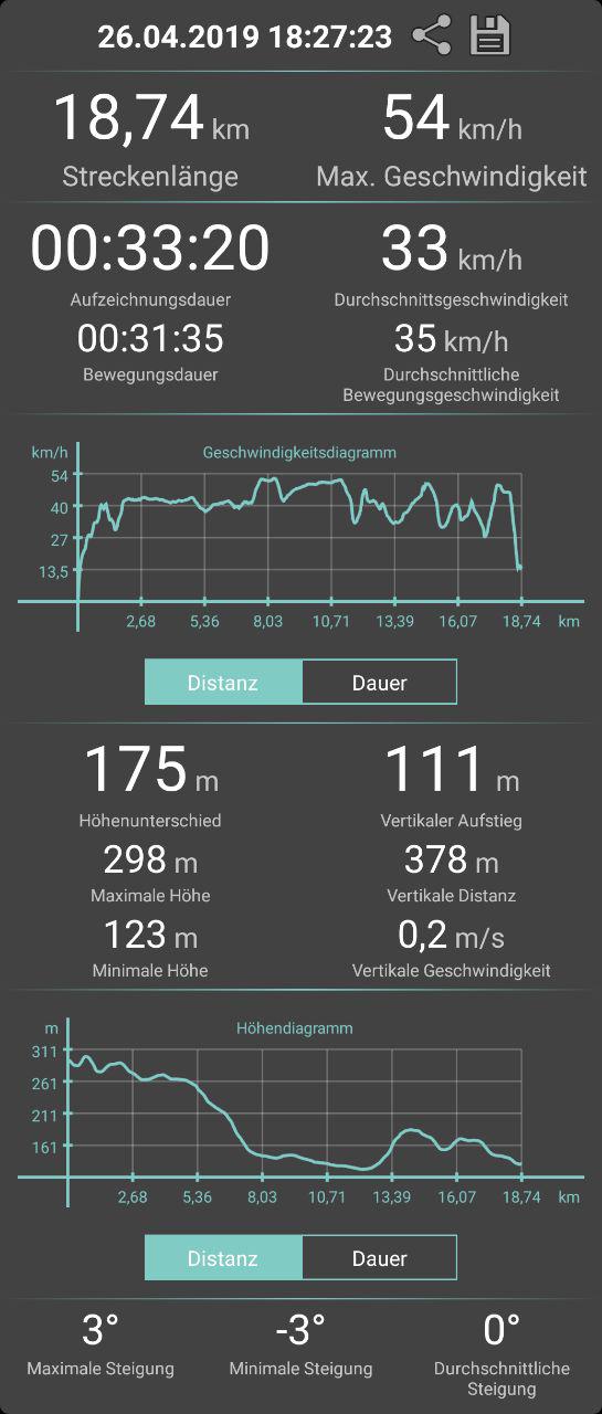 18,8km x 2 = 37,6km laut GPS. (laut Tacho 43,3km)