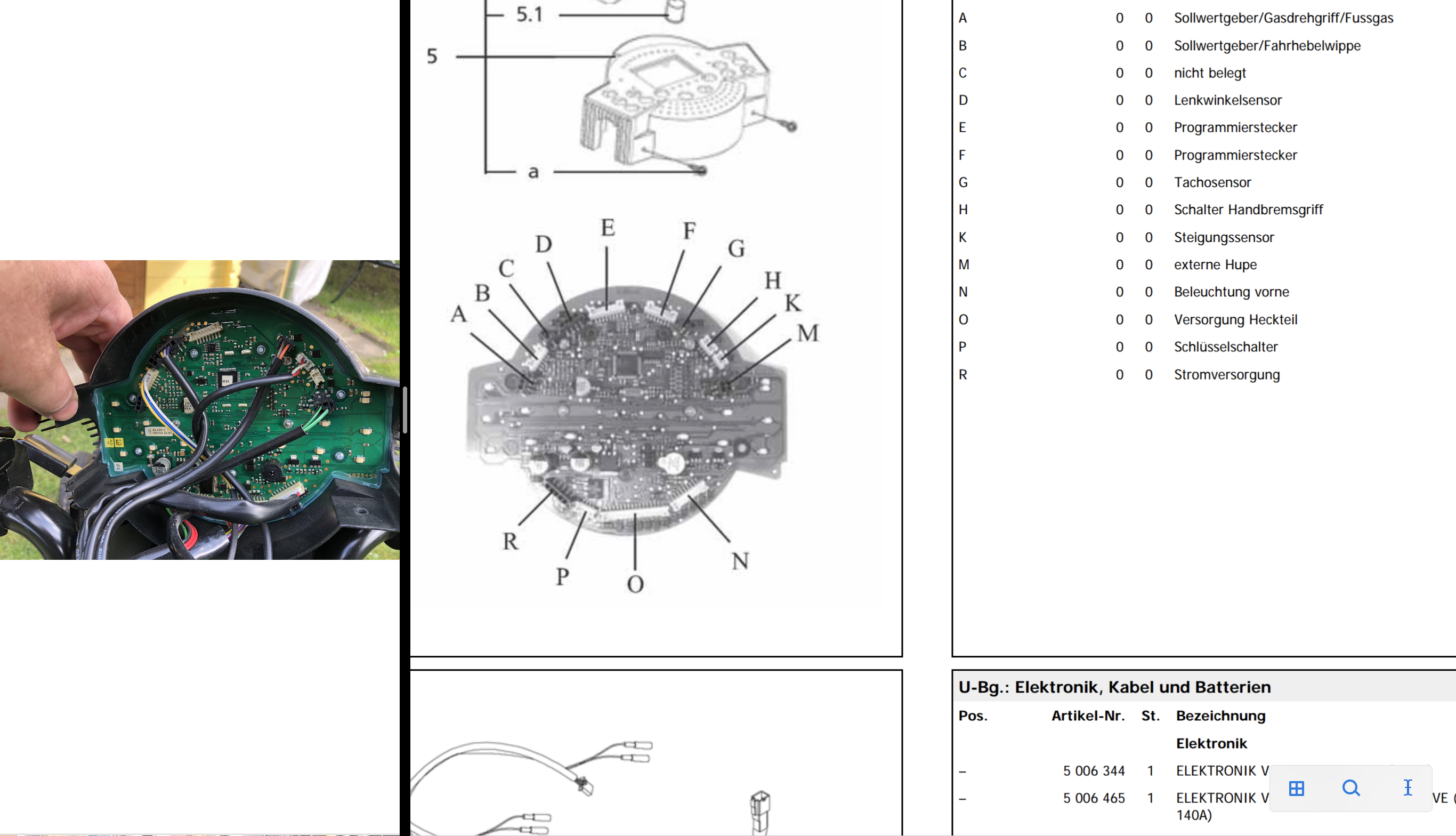 was meinst du mit Plan und Kabelfarben genau? Habe keinen Schaltplan, leider nur das oben gezeigte Bild aus dem Ersatzteile-Katalog (immerhin mit der Erklärung, welcher Port wofür ist). Kabelfarben... nun ja, habe natürlich alles aus mehreren Perspektiven fotografiert. Die Stecker sind auch alle unterschiedlich und verdrehsicher - da kann man keine zwei vertauschen oder einen Stecker verdrehen.
