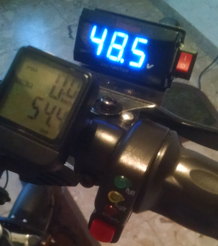 Schlussendlich hab ich mir in China ein billiges Volt-Display bestellt, einen kleinen Schalter daneben geklebt und das ganze an der Halterung für den rechten Spiegel befestigt. Da ich keinen bessern Messpunkt gefunden habe sind die Kabel von dem Volt-Display einfach gemeinsam mit den Kabeln vom Controller ausgehend in den Akku-Stecker gebastelt worden und ordentlich mit Heißkleber befestigt. Nicht schön aber funktioniert. Gibt es einen bessern Messpunkt für die Akku-Spannung ohne das Controller-Gehäuse zu öffnen oder Kabel durchzuschneiden?
