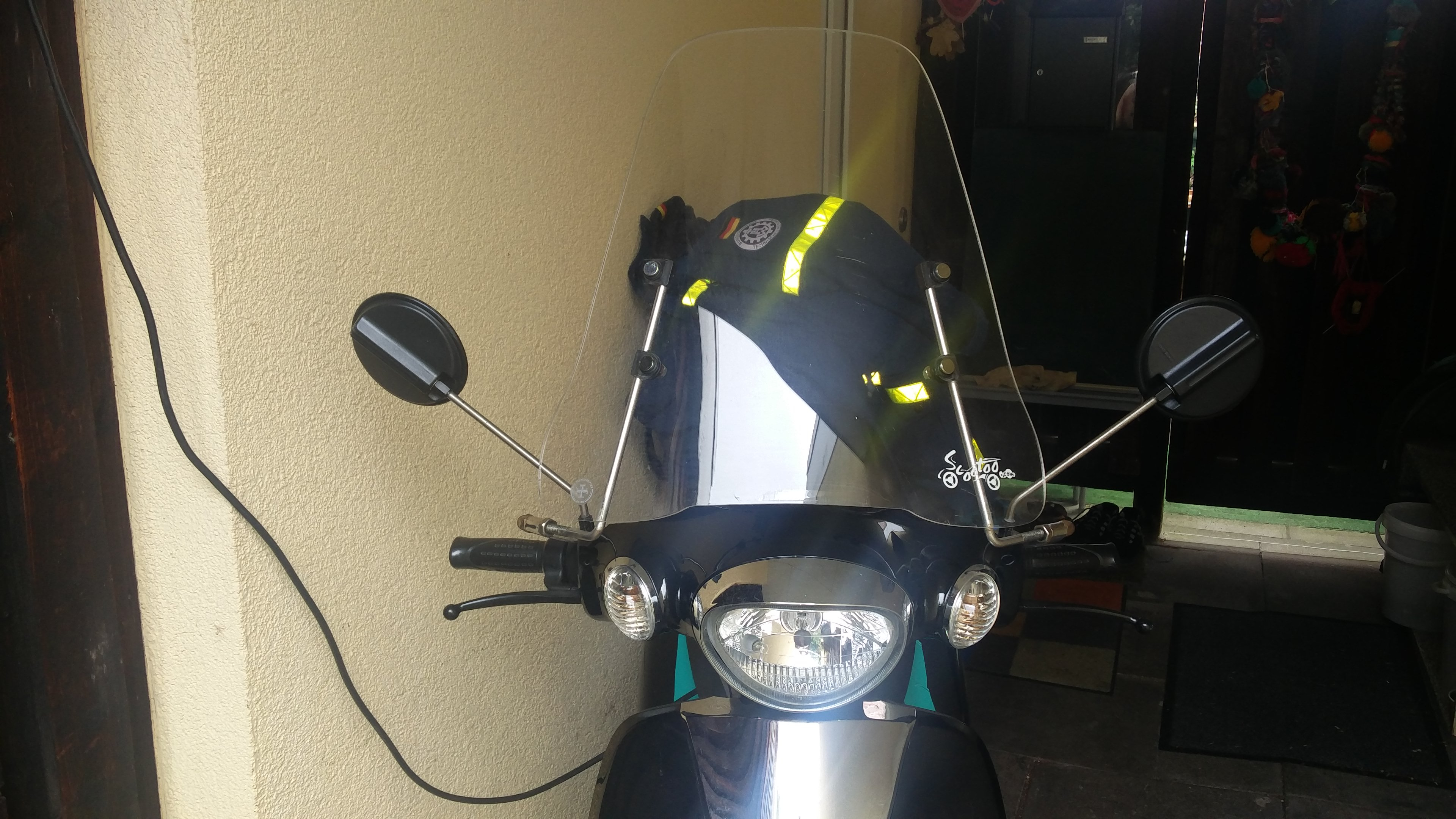 Das Schild hält den ganzen Wind vom Oberkörper fern, auch ein Teil vom Regen. Bin die Tage paar Mal nass geworden, Ellebogen ist die Jacke durch, Taschen von Innen trocken. Ist ein wenig fummelig das gerade und synchron auszurichten, das Schild war am gebrauchten Roller dran. Bin auch schon ohne gefahren, da flattert die Jacke mehr und es gibt paar Geräusche mehr. Das Schild hat auch einen Punkt wo es ein wenig pfeift, aber das lässt sich bedtimmt noch besser einstellen.